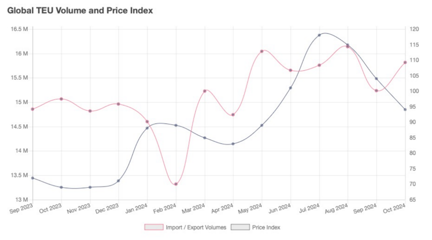 与此同时,刚刚公布的10月份集装箱贸易统计(CTS)数据显示,10月份全球共运输了1581.5万TEU,与9月份1520万TEU相比,增长了3.8%。